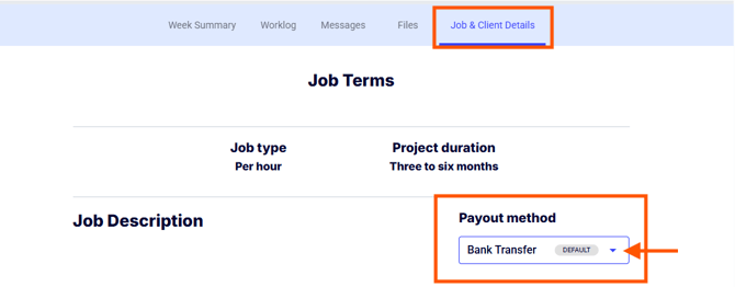 To check, go to the My Jobs - Active Contracts page, open the job, and click the “Job and Client Details” tab. Under Payout method, you’ll see the payout method associated with that job.